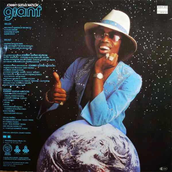 Johnny Guitar Watson 'Giant; DJM Records, 1978' Cara A 01. Miss Frisco (Queen Of The Disco) (Johnny Guitar Watson) 5:00 02. Tu Jours Amour(Johnny Guitar Watson) 4:40 03. Gangster Of Love (Johnny Guitar Watson) 3:45 04. Guitar Disco(Johnny Guitar Watson) 4:14 Cara B 01. Wrapped In Black Mink(Johnny Guitar Watson) 5:13 02. You Can Stay But The Noise Must Go(Johnny Guitar Watson) 6:07 03. Baby Face (She Said Do Do Do Do) (Sylvester Allen / Harold R. Brown /Morris 'B.B.' Dickerson / Leroy 'Lonnie' Jordan / Charles W. Miller / Lee Oskar /Howard Scott / Jerry Goldstein) 4:46 Intervienen en 'Giant': Johnny Guitar Watson: Guitarra, sintetizador (Moog), órgano, piano eléctrico Fender Rhodes, clavinet, congas, timbales Emry Thomas: Batería Darcus, Marci Thomas: Coros